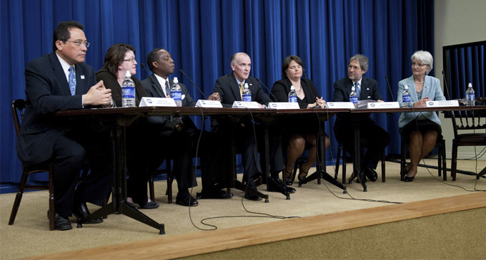 White House Forum Panelists (left to right): César Torres, Executive Director, Northwest Justice Project; Alison Paul, Executive Director, Montana Legal Services; Anthony Young, Executive Director, Southern Arizona Legal Services; James J. Sandman (moderator), LSC President; Colleen Cotter, Executive Director, Legal Aid Society of Cleveland; John Whitfield, Executive Director, Blue Ridge Legal Services; Phyllis Holmen, Executive Director, Georgia Legal Services
