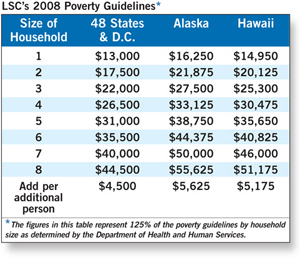 LSC has issued its income eligibility guidelines for 2008, which establish maximum income levels for individuals and families to be eligible for LSC-funded services. LSC's guidelines are based on 125 percent of the federal poverty level as established by the US Department of Health and Human Services.