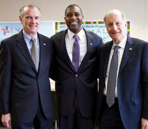 Above: Assistant Attorney General Tony West speaks at LSC’s Black History Observance. Below: West stands with LSC President James J. Sandman (left) and LSC Board Chairman John G. Levi. Photos by Dakota Fine.