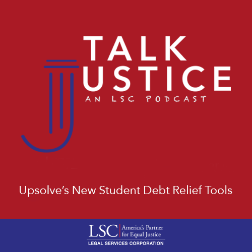 Guests from the online bankruptcy service Upsolve and Philadelphia Legal Assistance (PLA) discuss a new, free web resource for people struggling with student debt on Talk Justice. PLA received funding from a 2023 LSC Technology Initiative Grant for the project and brought on Upsolve to develop the tools. Their goal is to raise awareness of available debt relief programs and provide guided assistance for qualified borrowers to pursue student debt elimination.