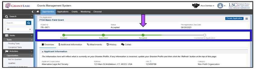 Once the Pre-Application has been submitted, LSC will, on a rolling basis, review and accept Pre-Applications. If a user’s Pre-Application is accepted, the status bar for that Pre-Application will be updated to “Accepted.”