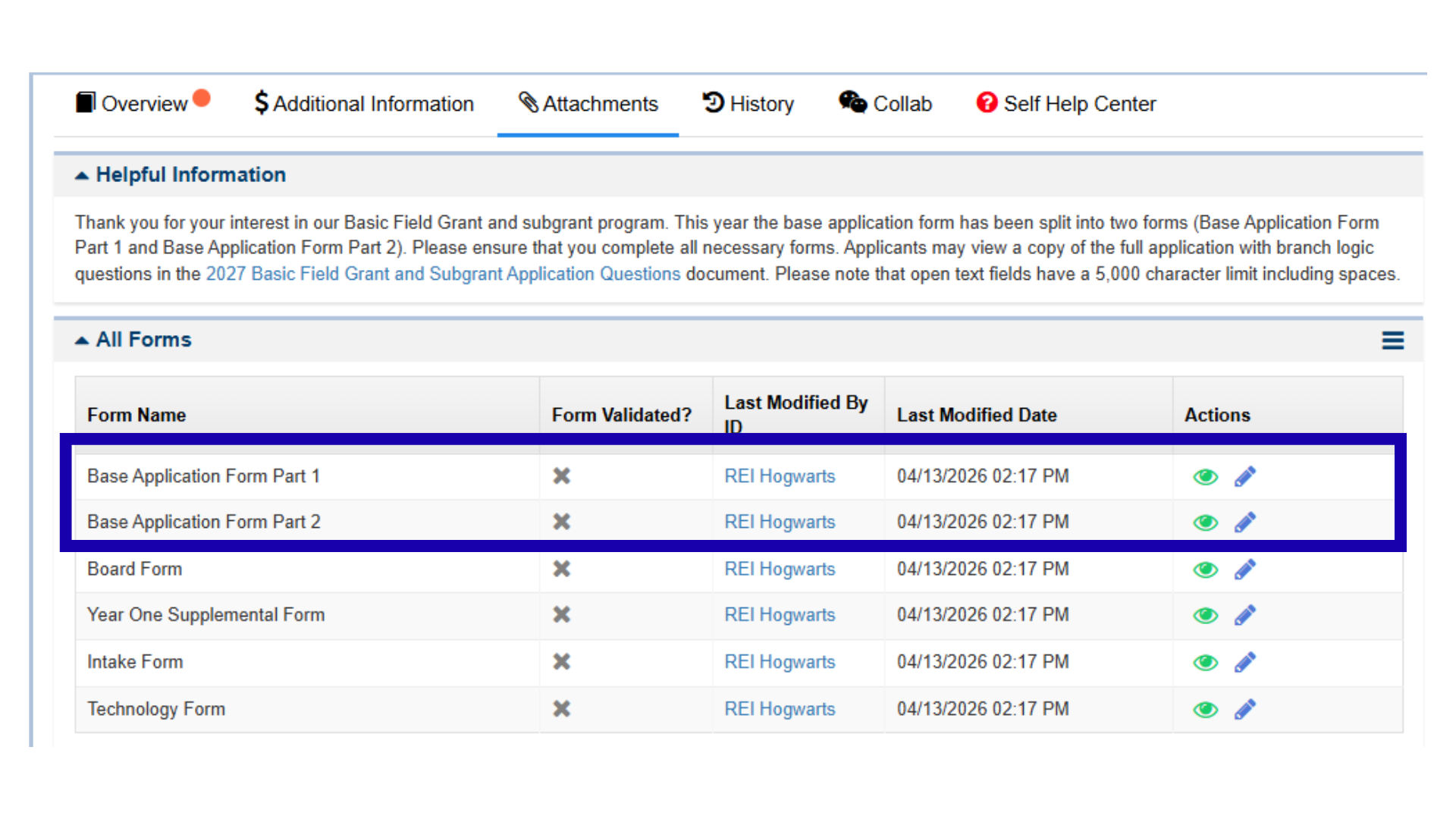 To begin the Base Application Form, users should select the blue pencil icon next to the form they want to work on.