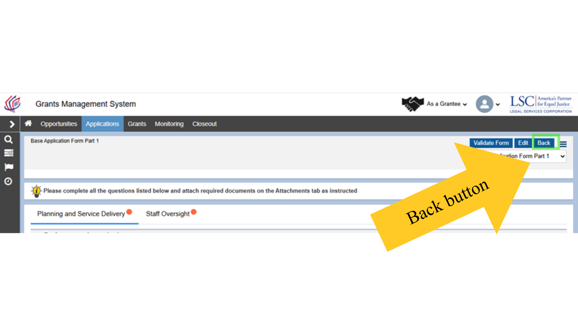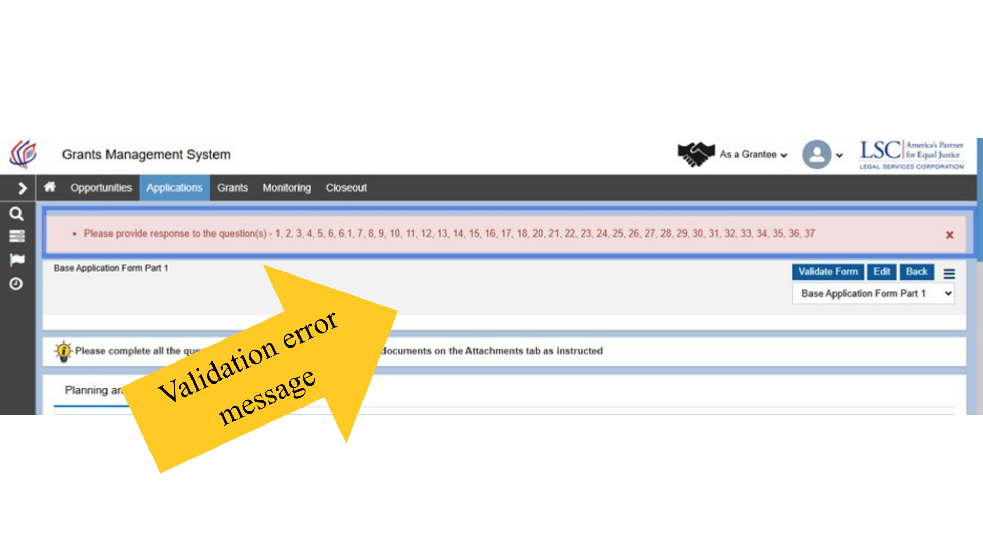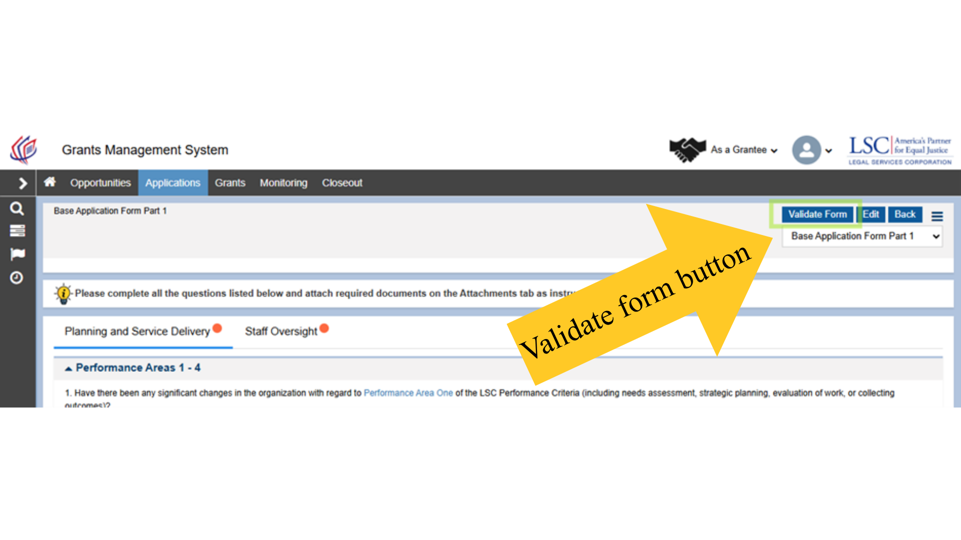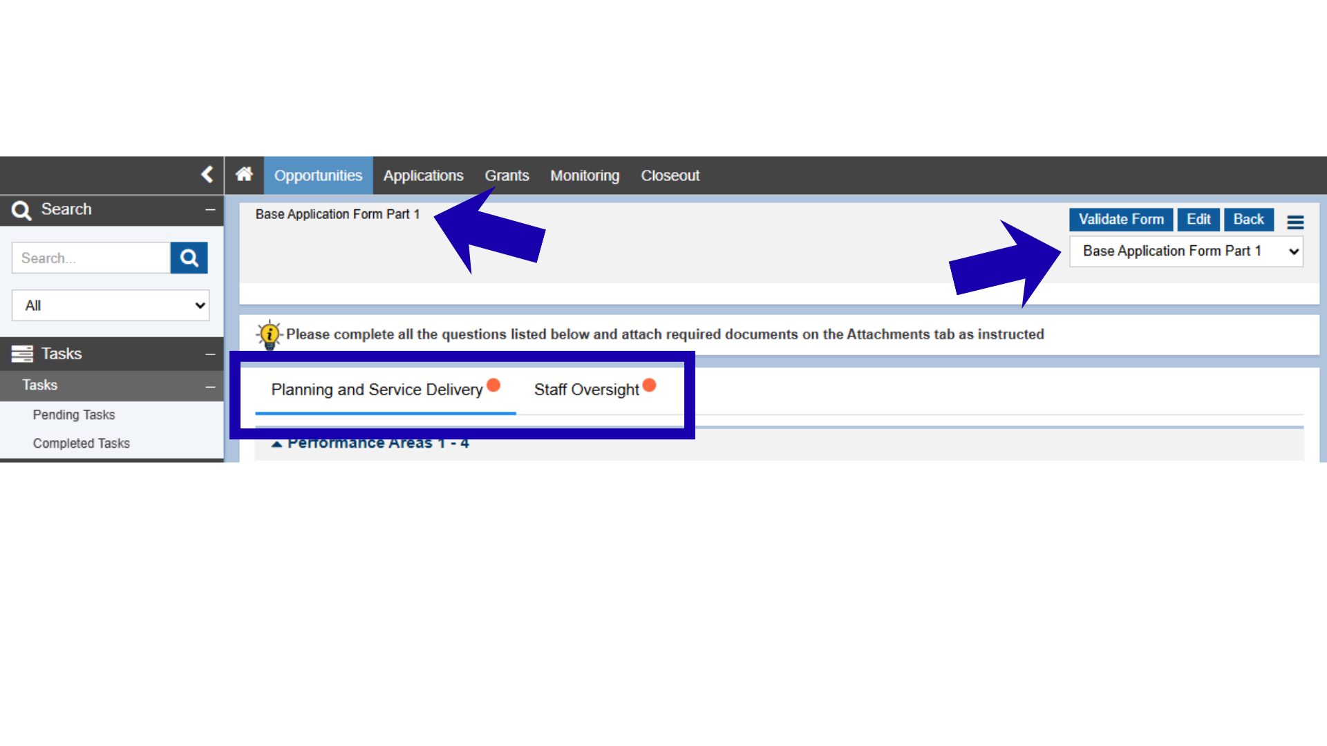 After completing, saving, and certifying all tabs in each part of the Base Application form, users should select the Validate Form button on the top right-hand side of the screen. This is a feature in GrantEase that will allow users to see which questions have been skipped or are incomplete.