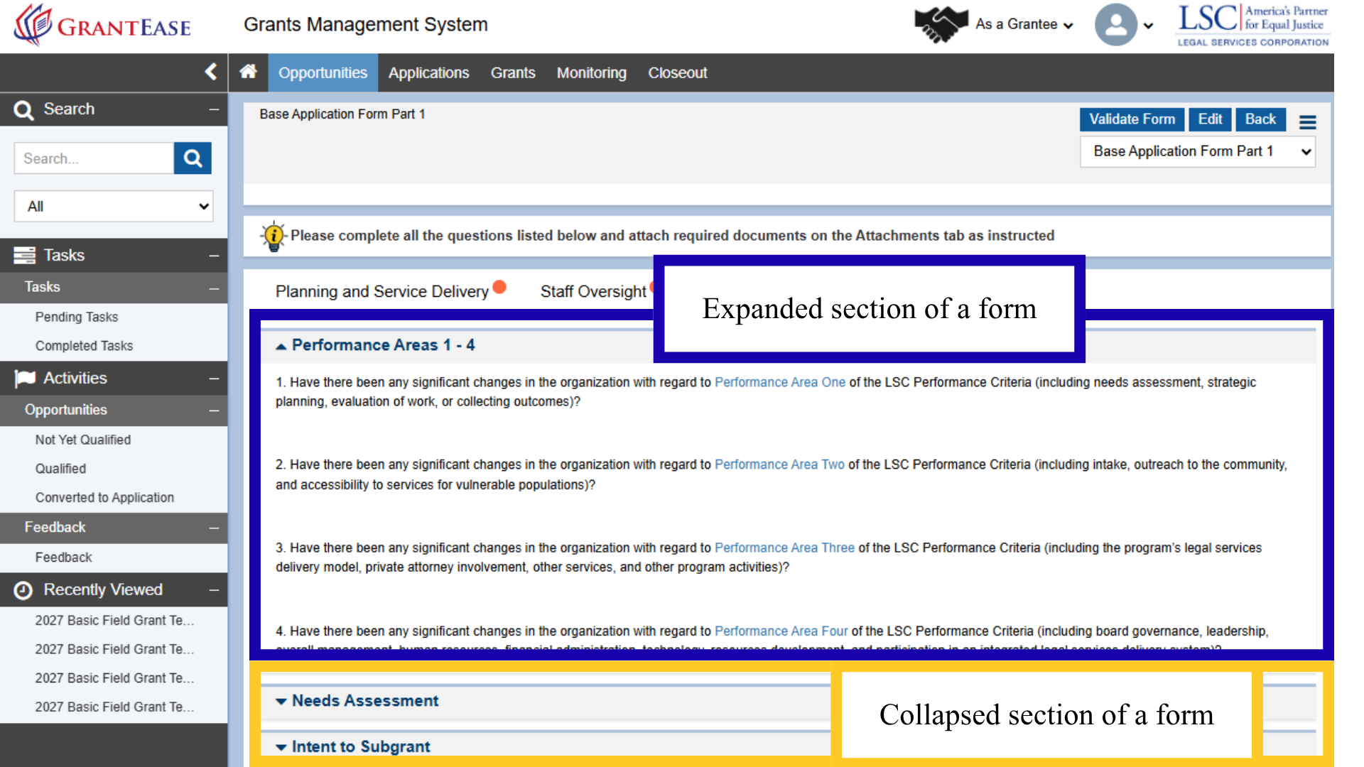 Additionally, users should note that GrantEase does not spellcheck a document. Thus, it is imperative that users find an external source to spellcheck their narrative answers. For example, users may want to install a software program like Grammarly. If users are interested in receiving information or training resources on these tools, please visit the LSC Training landing page.
