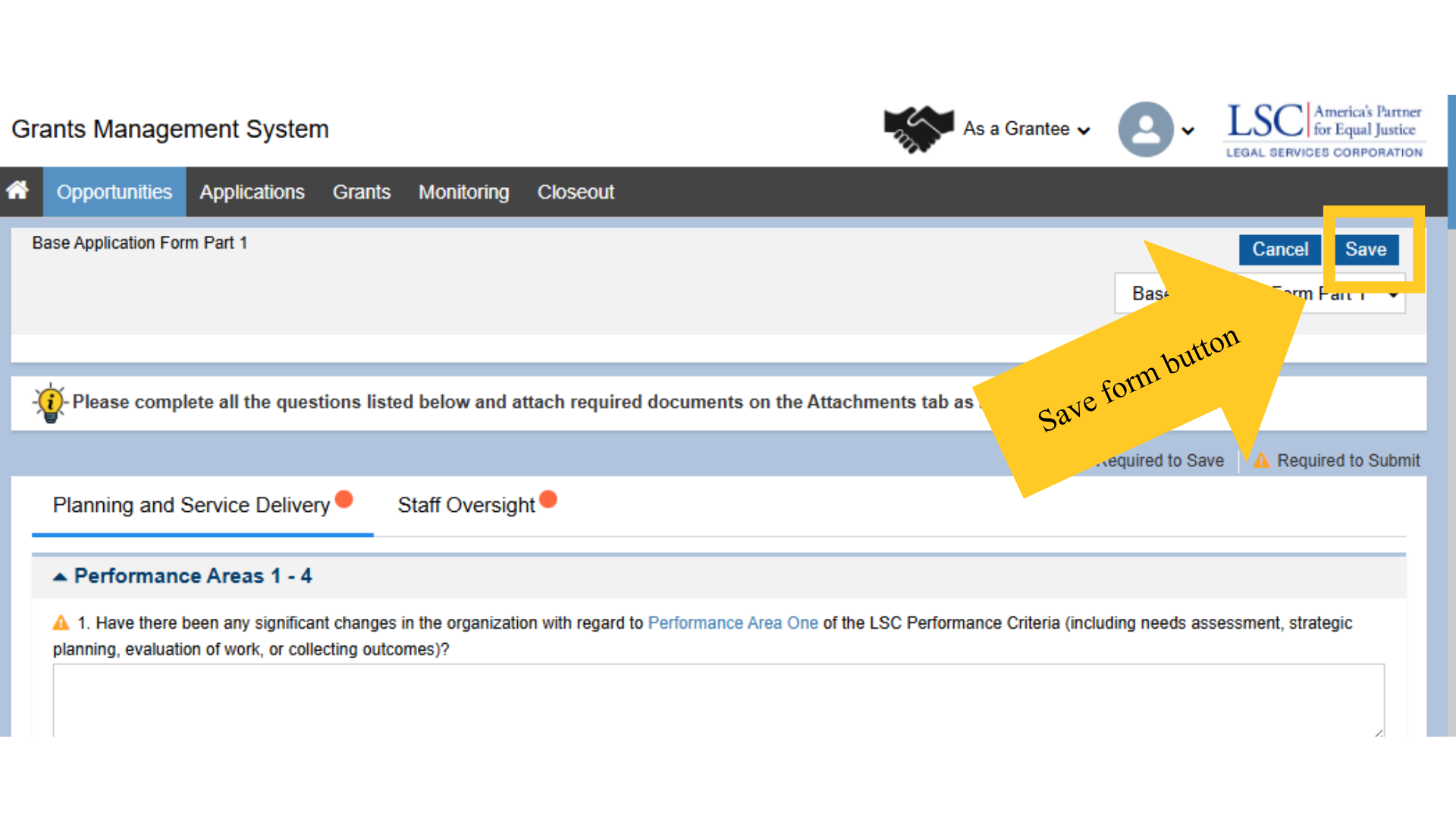 One of the most significant differences between the Base Application and the Pre-Application is that users need not complete the entire application in one sitting. Users may complete a few questions and come back to the form later. To ensure the information entered is saved, users are strongly encouraged to save every time they answer a question or set of questions in the Base Application form.