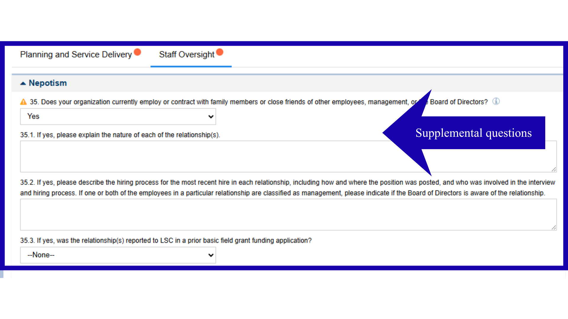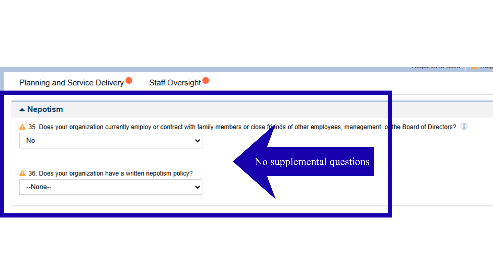 Supplemental questions will appear as the conditions of a form change. For example, if a user answers “No,” to question number 35. Does your organization currently employ or contract with family members or close friends of other employees, management, or the Board of Directors? they will move to question number 36.