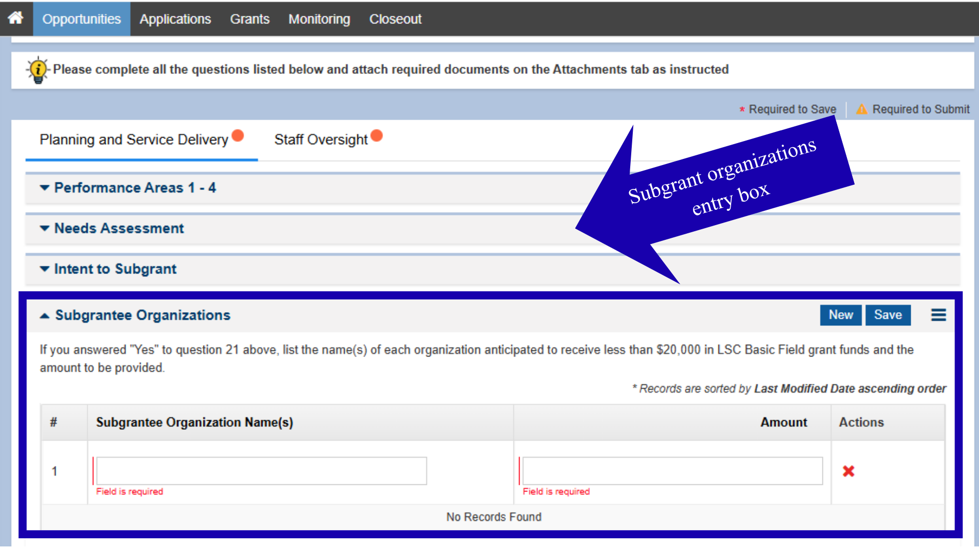 The responses to some questions require users to complete an information table. If users answer “Yes” to question number 1, that their organization intends to subgrant $20,000 or MORE of LSC funds, they will then be required to complete the Subgrant Application (please refer to the Subgrant Micromodule for steps).