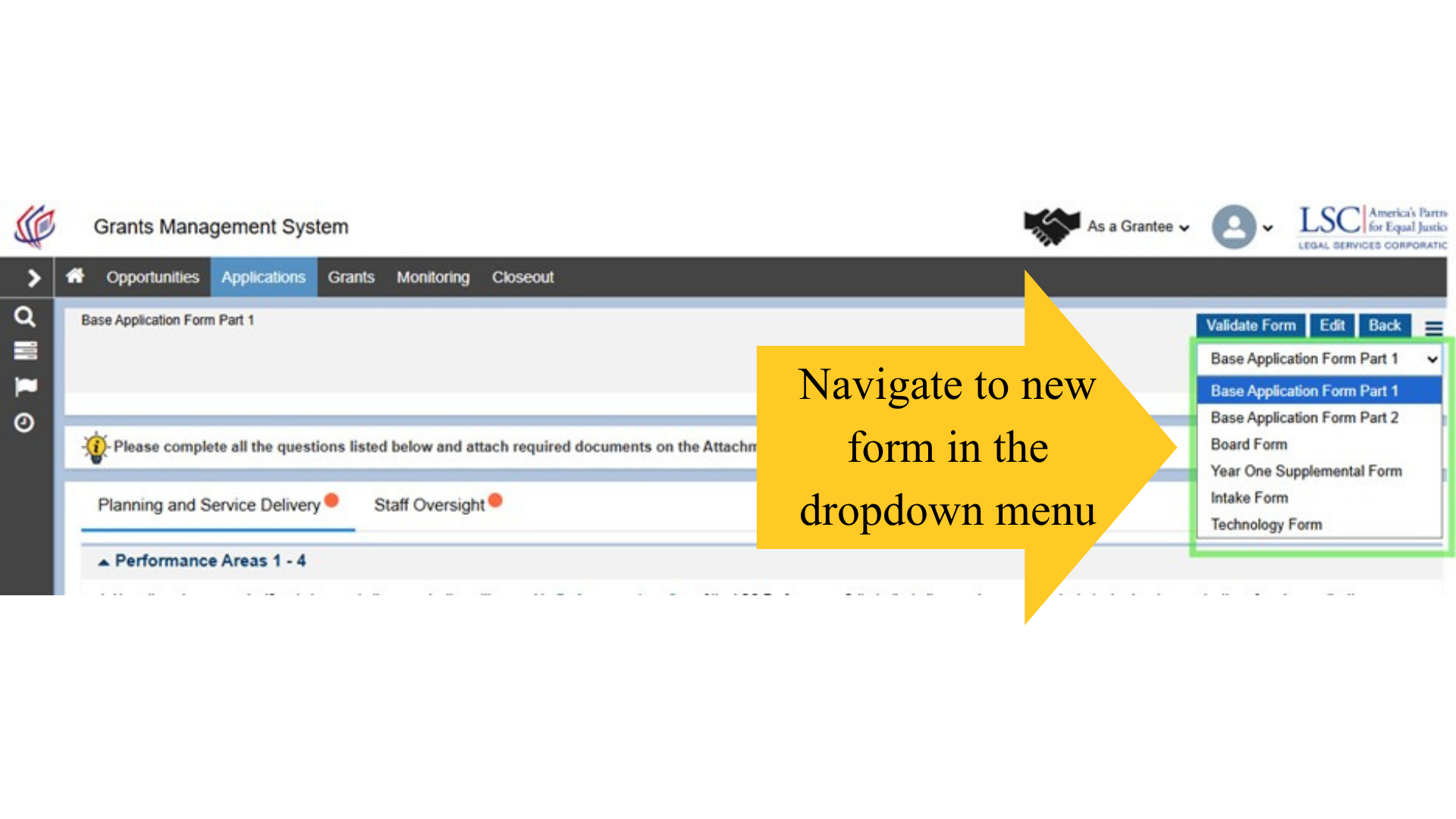 Once the Base Application form is completed and validated, users may select the Back button to navigate to the next form, or users may select the next form from the drop-down menu in the top right-hand corner of the screen and be taken to another form.